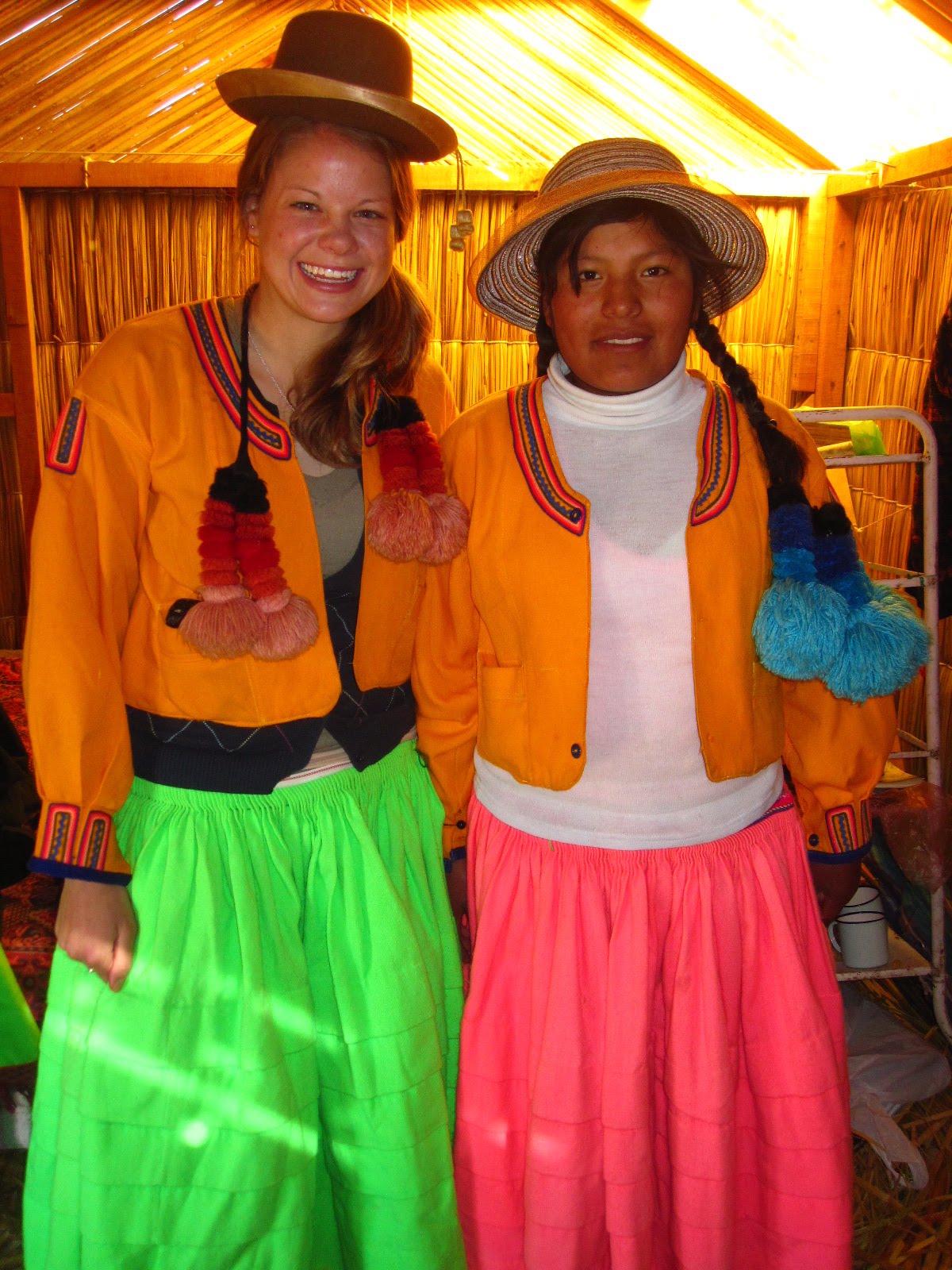 the lake with the islas and all of the colorfully dressed women were waving their arms trying to convince the boat drivers to steer over to their island. After passing a multitude of these we finally pulled over to one with a name I don't quite remember. We were greeted in their native language Aymará and were taught how to respond ("waliki") so we all followed suit. The women were running around putting down blankets on big reed benches for us and before long we were shown a demonstration of just how these fascinating islands were created. I think that was the most interesting part simply because we were actually on the island, feeling the squishing of the reeds beneath our feet and learning just how they were, and still are being put together. Apparently each year they have to add a new, fresh layer of reeds to the top to keep from going under. Interesting, 'eh?